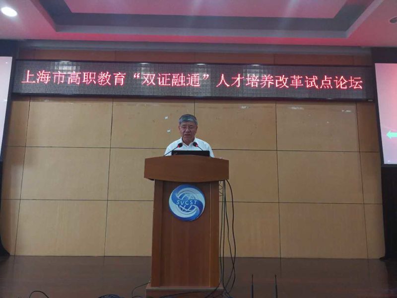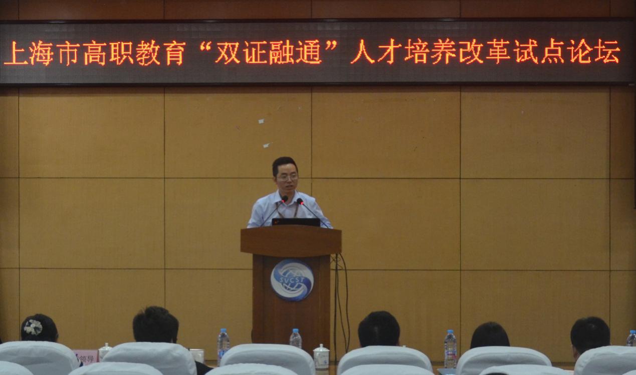 6月15日下午,上海市高职教育“双证融通”人才培养改革试点论坛在上海科学技术职业学院顺利举行。上海市教委高教处副处长赵坚,上海市职业技能鉴定中心主任孙兴旺,研发管理科科长夏莹,考务管理科科长孙德荣,以及21所“双证融通”改革试点高职院校分管领导、教学管理部门领导、试点专业主任以及相关专业教师出席了论坛会。