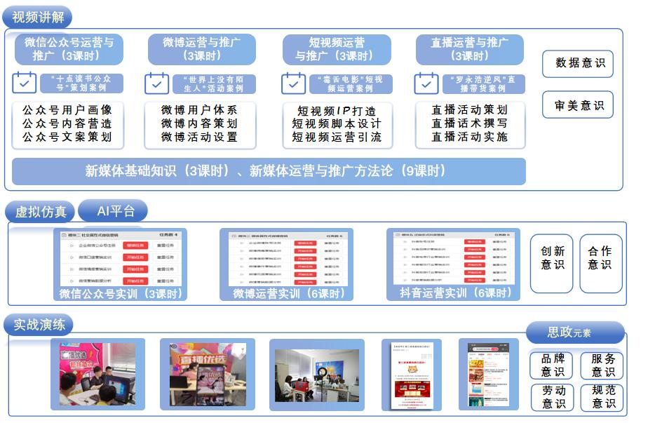 《新媒体运营与推广》是电子商务专业的核心课程。该课程依据“岗课赛证综合育人”教学理念,以“科技助农·营销国货·古韵之旅”的国风推广为思政主线贯穿教学过程,“校企行”三方合力,以鲜花饼等国货产品、章堰农产品、民宿古镇等酒旅产品为载体,开展项目化教学,在知识学习的同时重点培养学生合作意识、创新意识、品牌意识、审美意识、服务意识、规范意识、劳动意识、数据意识等“八个意识”,达成“懂原理、知流程、明技巧、善制作、精运营、具思维”的培养目标。