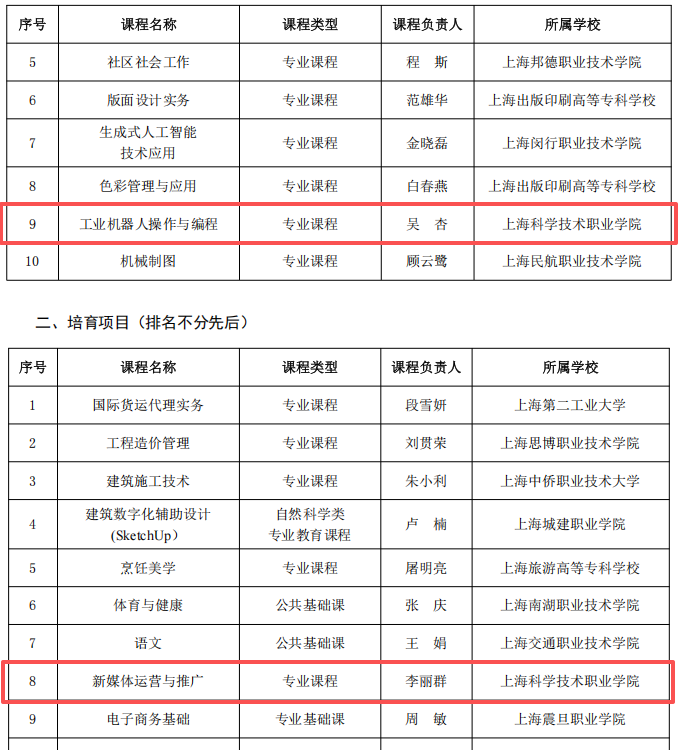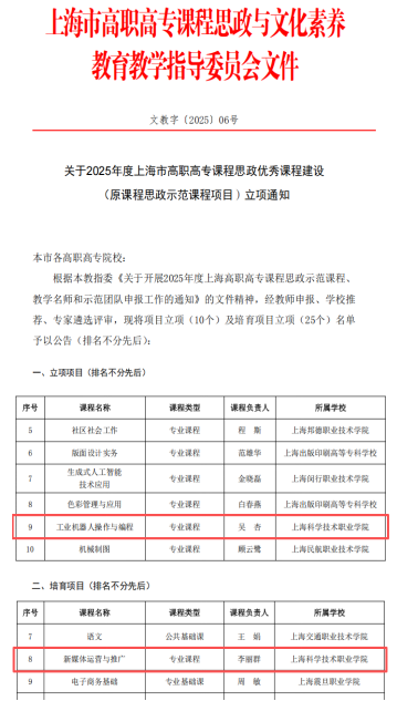 近日,上海市高职高专课程思政与文化素养教育教学指导委员会发布《关于2025年度上海市高职高专课程思政优秀课程建设(原课程思政示范课程项目)立项通知》,我校申报的两门课程全部入选,其中《工业机器人操作与编程》获批立项项目,《新媒体运营与推广》获批培育项目。![]()