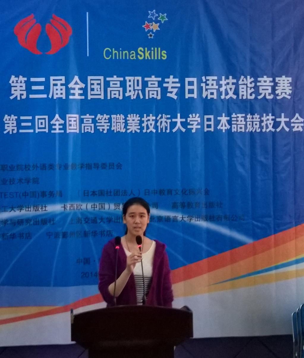 秋风送爽,丹桂飘香,2014年10月16—19日, “J.TEST杯”第三届全国高职高专日语技能竞赛在宁波职业技术学院圆满结束。我院人文社科系应用日语专业选派了两名个人赛选手和一支团体赛队参加了此次比赛。在这场高水平、竞争激烈的角逐中,我校代表队不负众望,表现卓越,获得个人赛项三等奖和优秀奖一项,指导教师赵建农老师荣获优秀指导教师奖。