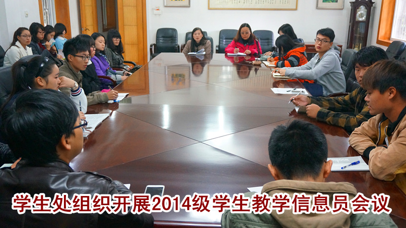 11月18日,学生处于第一会议室组织开展2014级学生教学信息员第一次会议。后勤保卫处副处长黄晓敏、教务处处长助理张静、学生处思政科科长唐丽娜、教务处郭炳心老师、学生工作处许云峰老师以及24名2014级各专业教学信息员出席此次会议。