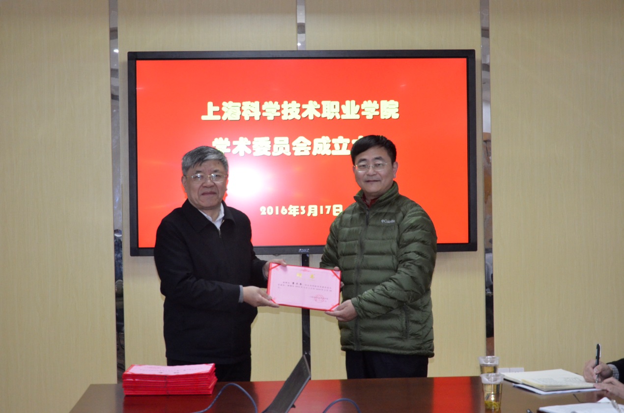 党委书记、院长庄顺根首先在会上发表讲话。他说,根据国家教育部、上海市教委的要求,高职院校需要成立学术委员会,并制定相应的章程,学院应积极响应并贯彻落实。根据文件精神,他就学术委员会人员组成条件,产生方式,及任期做了相应的说明。经过民主推荐,院长办公会讨论通过董大奎、韩芳、许福生等11人为第一届学术委员会委员,与会人员一致同意并鼓掌通过,推选董大奎为主任委员,韩芳、许福生为副主任委员。学术委员会成立后,原学院教学建设委员会同时撤销。