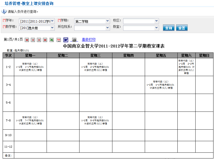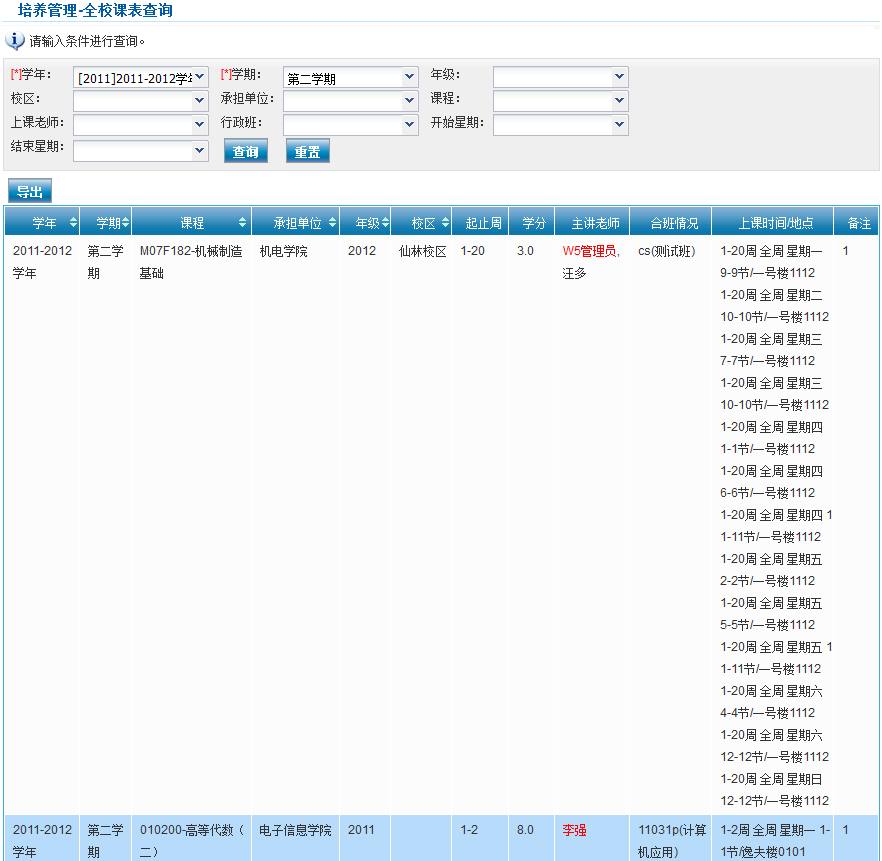 系统进入“培养管理-全校课表查询”页面,如下图所示。