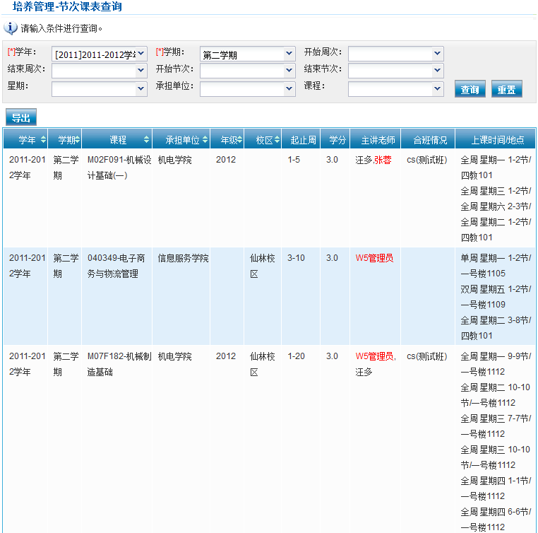 单击“导出”将节次课表查询结果以excel表格形式导出。