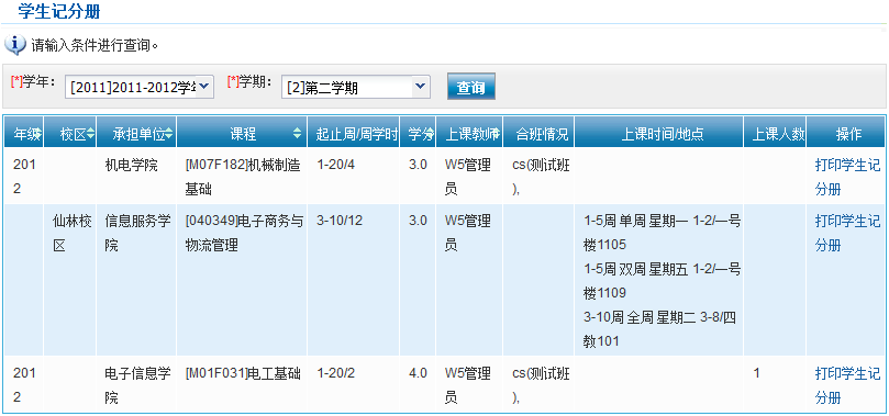 单击“打印学生记分册”,将该课程的学生记分册打印出来。