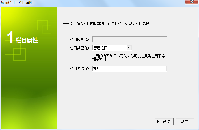 ”,添加栏目。编辑栏目名称后,点击下一步直至完成。