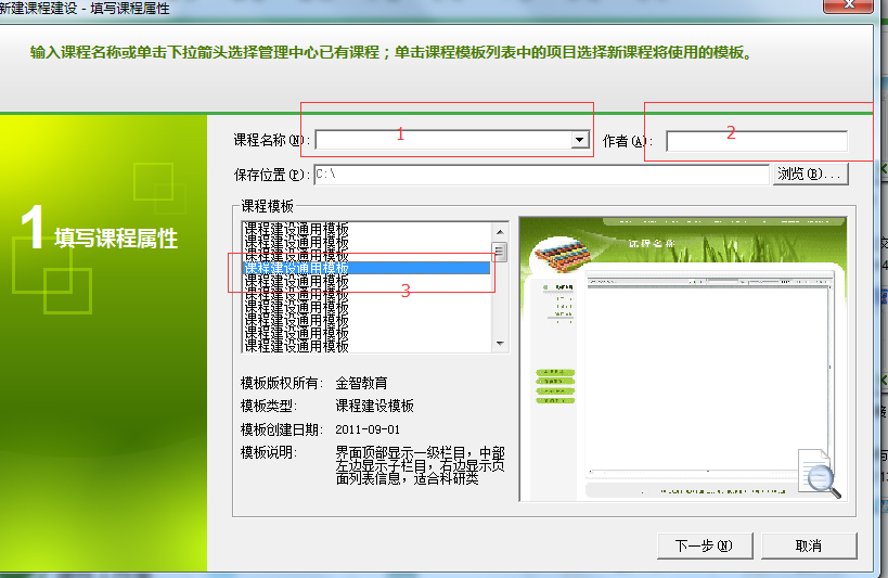 。填写课程名称,作者,保存位置(可不填,使用默认地址)。选择课程模板