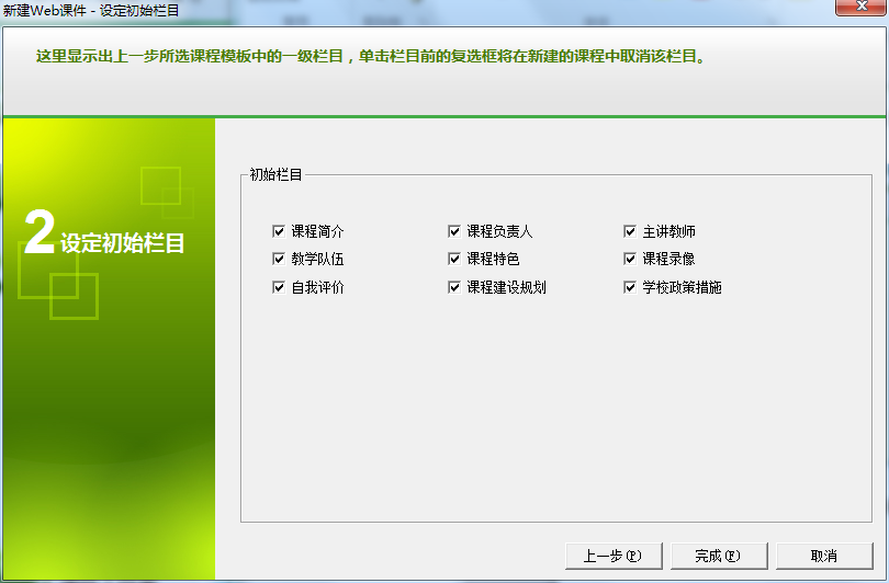 勾选初始栏目,保留需要的栏目。(栏目以后可编辑)最后点击完成