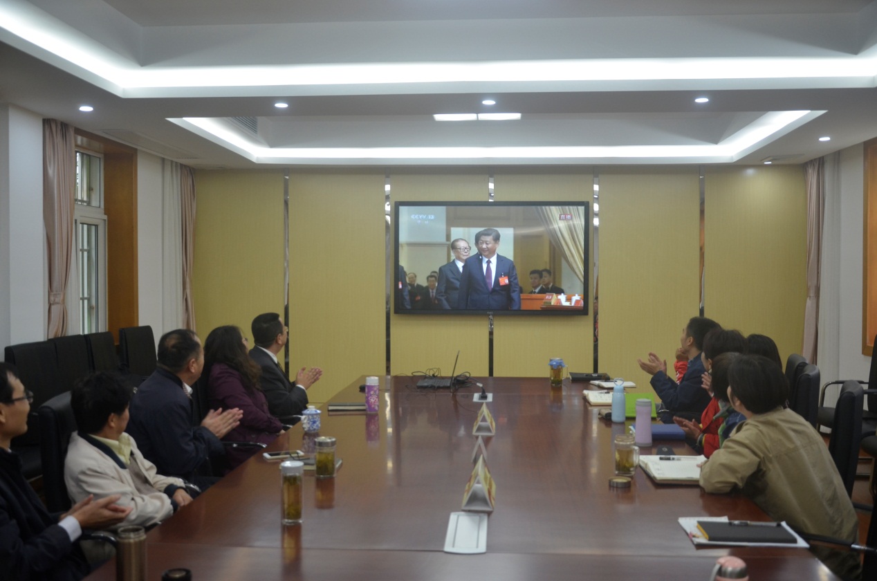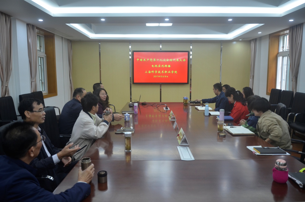 10月18日上午九点,中共共产党第十九次全国代表大会在人民大会堂隆重开幕,习近平代表第十八届中央委员会向大会作了题为《决胜全面建成小康社会 夺取新时代中国特色社会主义伟大胜利》的报告。上海科学技术职业学院全体党委委员、院级领导、党支部书记、教师代表以昂扬的精神面貌在行政楼第一会议室集体收看了此次开幕式。