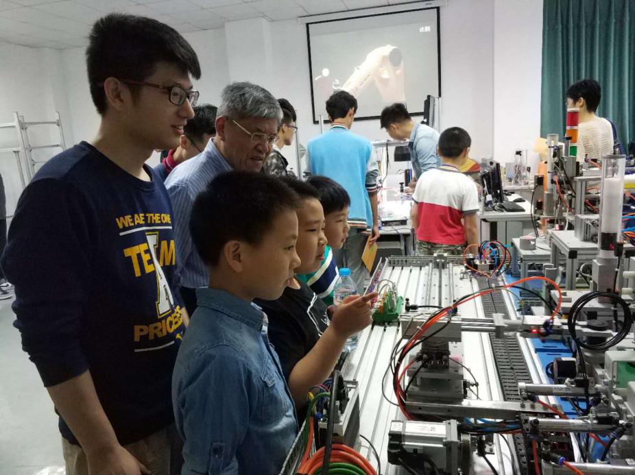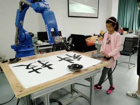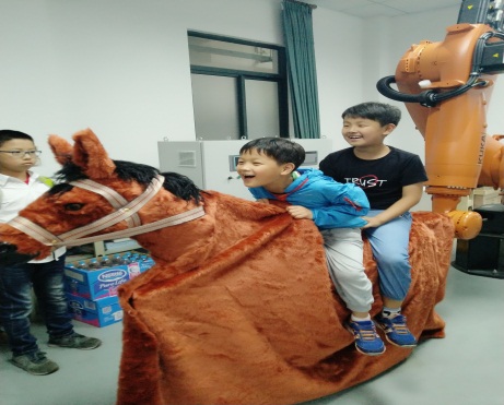 智能机器人应用项目包括基于工业机器人控制的儿童骑马、工业机器人写毛笔字、智能相机检测系统讲解及演示、流水线平台讲解及演示以及3D打印。体验者们在老师及学生志愿者的帮助和指导下,或操控工业机器人书写毛笔字,或操作工业机器人控制的马匹上下、左右运动,或骑在工业机器人控制下的马匹上,或沉迷基于可编程控制器控制的自动装配生产线的演示,自动完成生产线的取料、装配、传送、识别检测等。