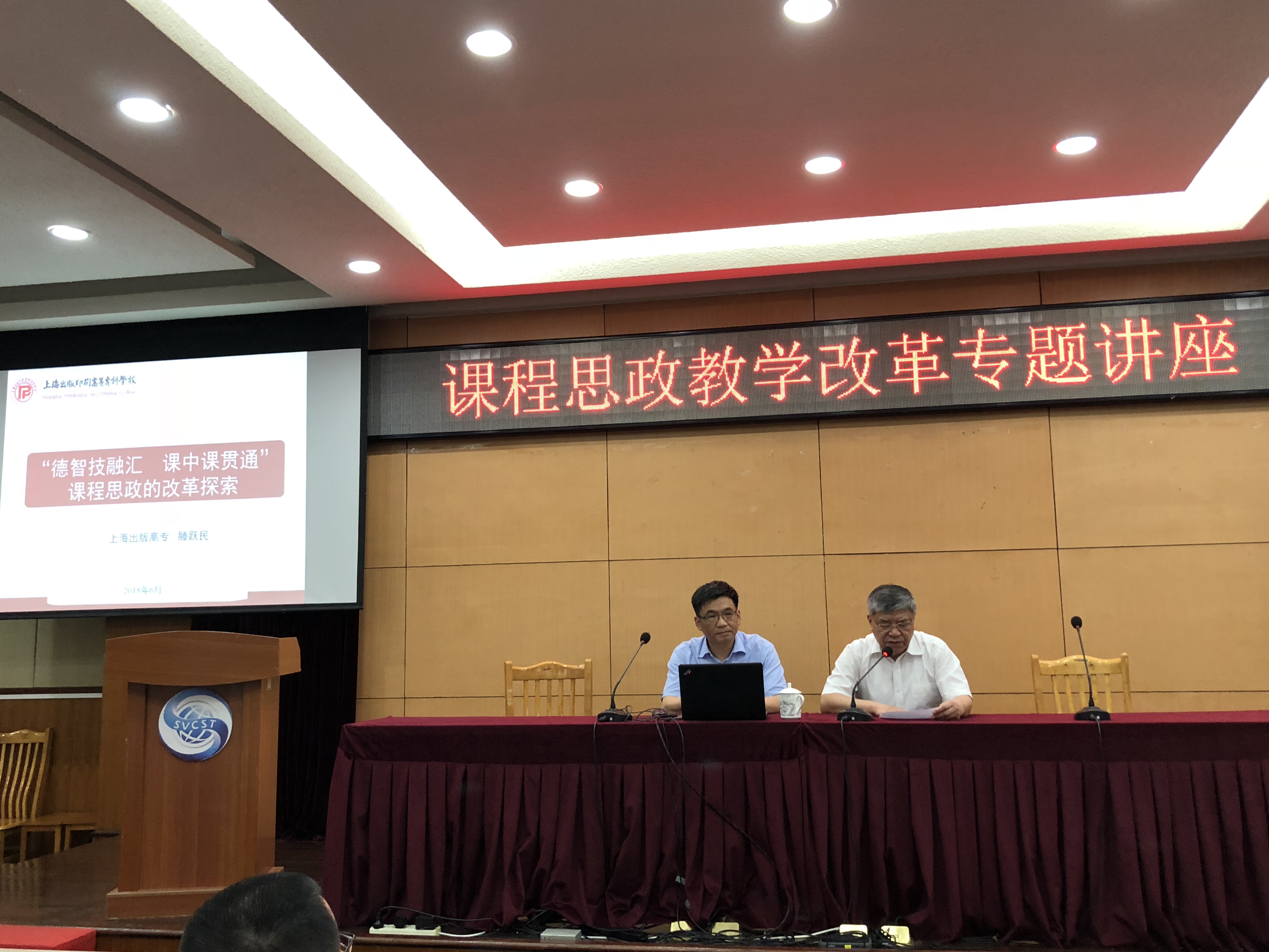 为推进落实“构建高校课程思政”教育教学体系的改革方案,6月8日下午上海出版印刷高等专科学校常务副校长滕跃民教授应邀为我校全体教职员工作题为“‘德智技融汇 课中课贯通’课程思政改革探索”的专题讲座,讲座由学院院长董大奎教授主持。