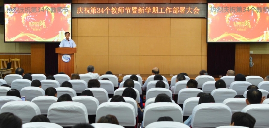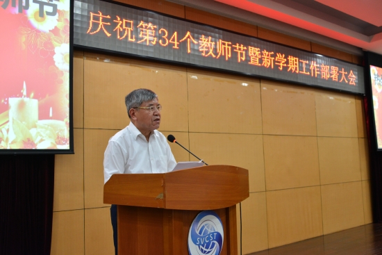 笔尖耕耘桃李地,墨水浇开智慧花。在这硕果飘香,秋韵荡漾的金秋时节,我们迎来了第34个教师节。2018年9月7日下午,上海科学技术职业学院全体教职员工齐聚多功能报告厅,召开庆祝第三十四个教师节暨新学期工作部署大会。党委书记王云飞主持会议。