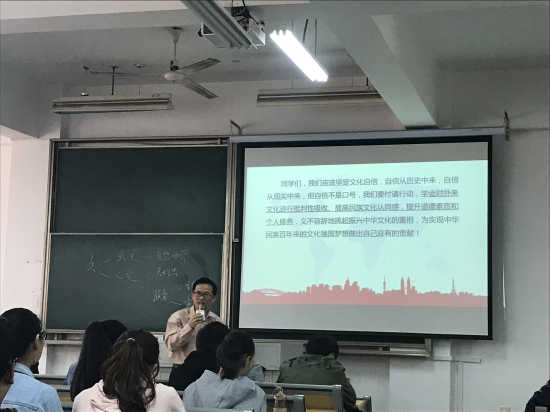 谢国日老师主讲的内容为“坚定文化自信”。通过新鲜的新闻事件和丰富的史实材料,谢老师从“什么是文化自信”、“为什么要提文化自信”和“为什么能提文化自信”三个方面,层层递进,深刻阐释了“文化自信”这一主题。朱佳老师主讲的内容为“尊重和维护法律权威”。她从影片案例导入课程,在互动和提问中推进教学,然后从“信仰法律”、“服从法律”、“遵守法律”和“维护法律”四个方面启发学生树立法律思维,提高知法、守法自觉性和责任感。