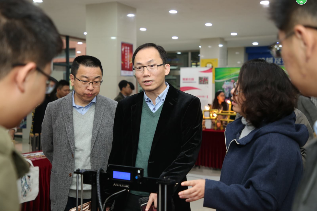 下午一点三十分,来校参加“海纳百创·2018创新创业文化节”开幕式的上海市就业促进中心副主任杨永华、上海市嘉定区就业促进中心主任沈继良、上海市嘉定区嘉定镇街道办事处副主任陆国华、上海市嘉定区就业促进中心副主任刘星、上海市嘉定区嘉定镇街道劳动保障服务中心主任高松杰、上海工商职业技术学院副院长王中强等来宾在我院党委书记王云飞、常务副院长韩芳、招生就业处处长曾喜平、学生工作处处长沈斌、对外合作交流处处长宋柏红等陪同下来到展示区,饶有兴趣地观看各社团展出样品,询问了解功能作用,不时地与学生交流。