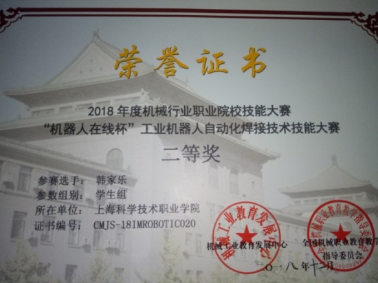 本次大赛是我们国家在机器人自动化焊接技术方面对接世界技能大赛的首次尝试,来自全国12省市的共37支参赛队伍同场角逐。我校通信与电子信息系的2016级应用电子专业韩家乐和安书魁两位同学,在指导老师张东带领下,经过暑假的刻苦练习以及平时的工控精英社锻炼,经历了为期3天的激烈比赛,最终荣获了全国工业机器人自动焊接技术技能大赛的二等奖。