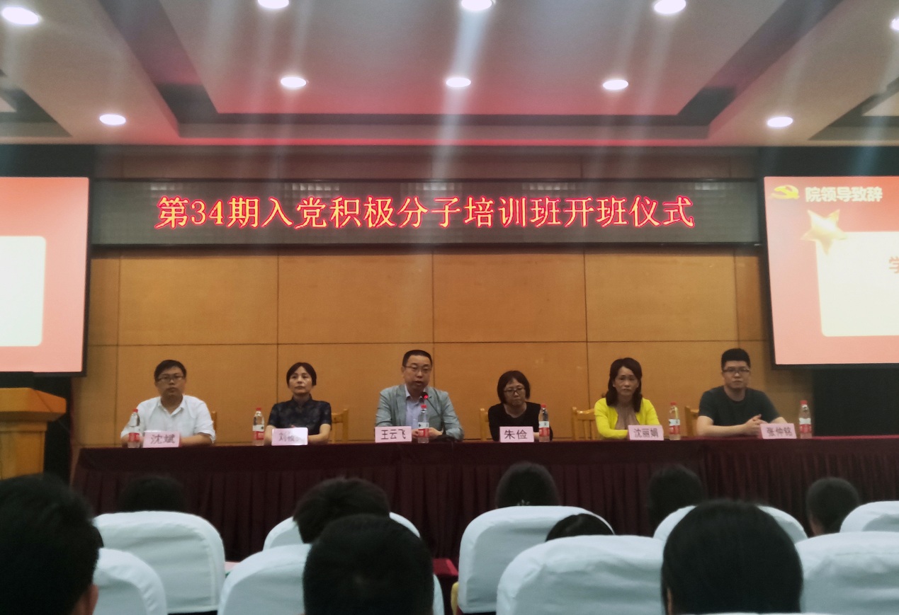 为进一步提高入党积极分子的思想认识和理论水平, 5月16日中午,我院第34期党校入党积极分子培训班开班仪式于学院五楼报告厅如期举行。此次开班仪式由我院学生工作处处长沈斌主持,学院党委书记王云飞及各院系党支部书记出席本次开班仪式。