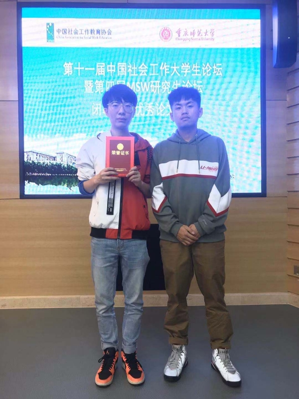 10月12日,由全国社会工作专业学位研究生教育指导委员会和中国社会工作教育协会主办的第十一届中国社会工作大学生论坛暨第四届MSW研究生论坛在重庆师范大学召开。我院人文与社会科学系社会工作专业学生周道宇同学撰写的论文《社工路上的寻心之旅》凭借优秀研究成果成功入选本次论坛,荣获三等奖。