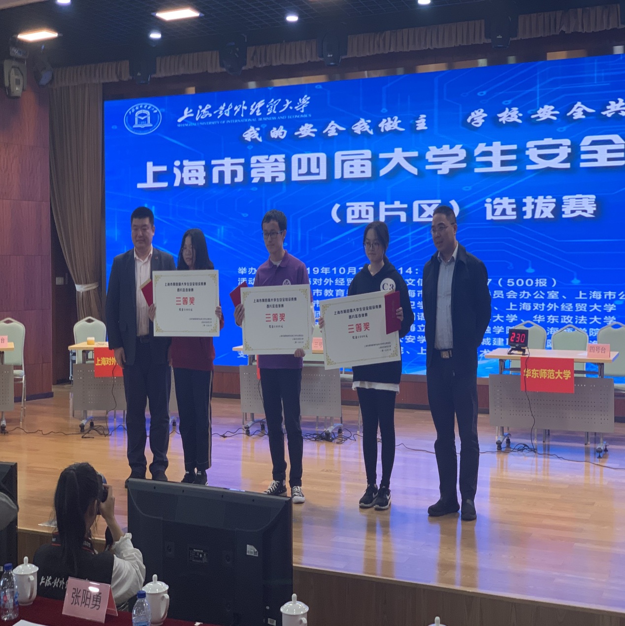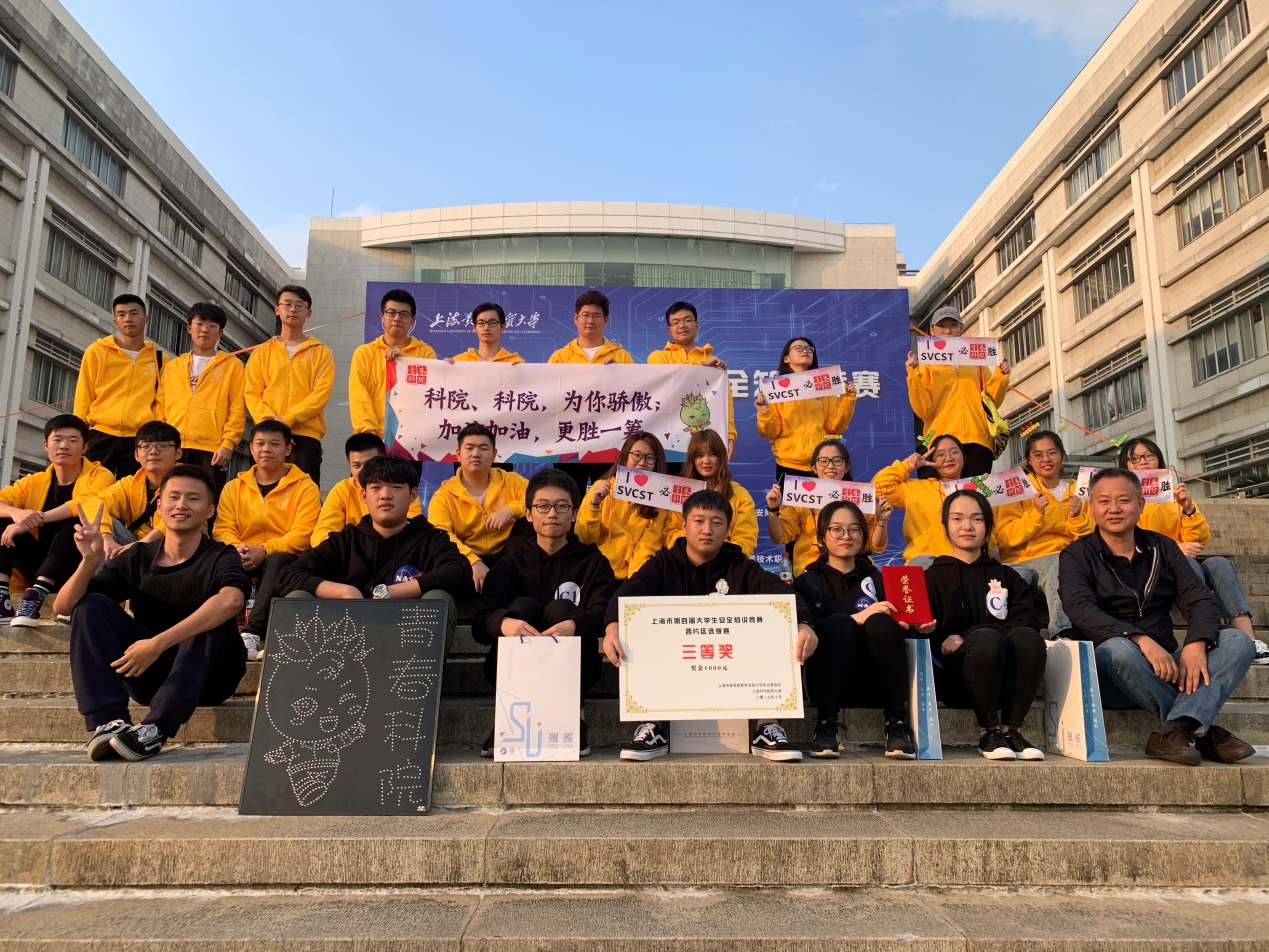 10月23日,由上海市教育委员会、上海市应急管理委员会办公室、上海市公安局主办,上海市高等教育学会保卫学专业委员会和上海对外经贸大学承办的,上海市第四届大学生安全知识竞赛西片区选拔赛在上海对外经贸大学松江校区信息大楼报告厅举行,包括我院在内的13所学校参加此次比赛。由后勤保卫处的袁爽担任指导老师,张华老师挂帅,带领我院五名队员和二十名啦啦队员,首次在此类比赛中取得三等奖的好成绩。