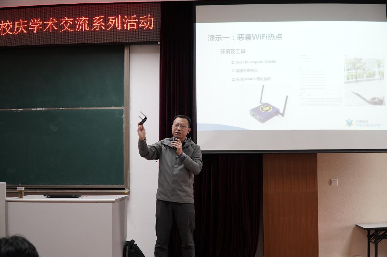 韩芳致辞欢迎杨德明高级讲师后,讲座拉开了序幕。杨老师从网络安全场景演示入手,让在场师生了解到恶意WiFi热点、无处不在的物联网安全隐患等产生的一系列问题,然后他给出问题:对手是谁?进而揭示了不同层面的威胁,包括:国家层面—网络战部队;组织层面—黑客组织和黑色产业链,网络空间成为新疆域,对抗无时不在。通过网络安全防范案例,我们了解到个人网络安全可以从增强个人信息保护意识、在社交媒体上做好信息保护、防范社会工程学、最小化提供个人信息、慎用生理信息采集技术五个方面有效保护个人信息。而网络攻击的一般防范措施则包括:增强个人信息保护意识、 必要的技术措施和手段、做好漏洞管理和防范社会工程学攻击。最后,杨老师谈到了网络安全的法律边界问题,网络不是“自留地”,借助《网络安全法》、《刑法》、《保密法》三大法,约束网络中的你我他。