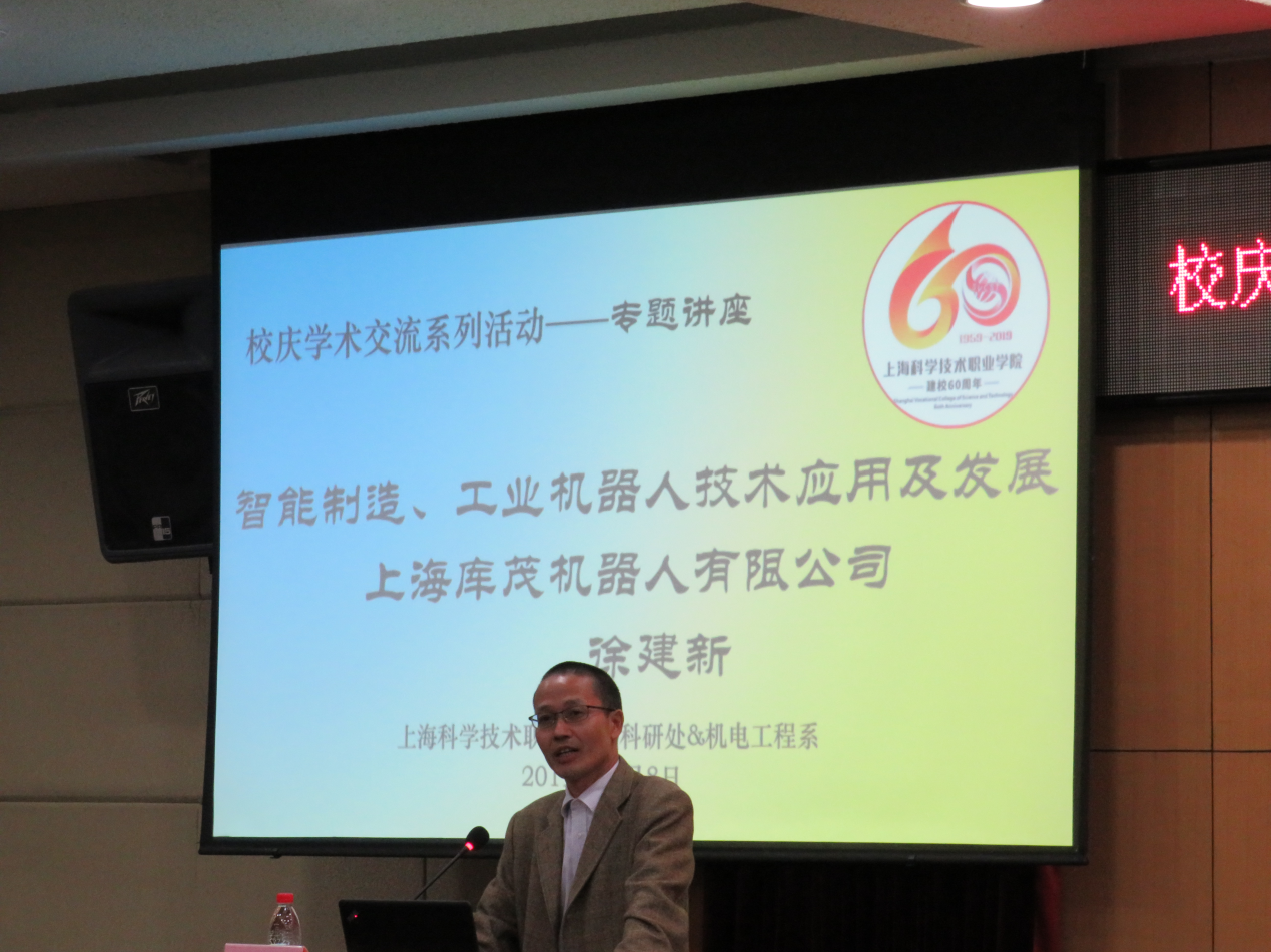 应我院科研处、机电工程系联合邀请,上海库茂机器人有限公司技术副总监徐建新于2019年11月8日来我院开展了主题为“智能制造、工业机器人技术应用及发展”的专题学术讲座。出席此次讲座的有我院科研处处长徐华、机电工程系工业机器人专业管佳燕老师及机电工程系等近300名师生。讲座由科研处处长徐华主持。