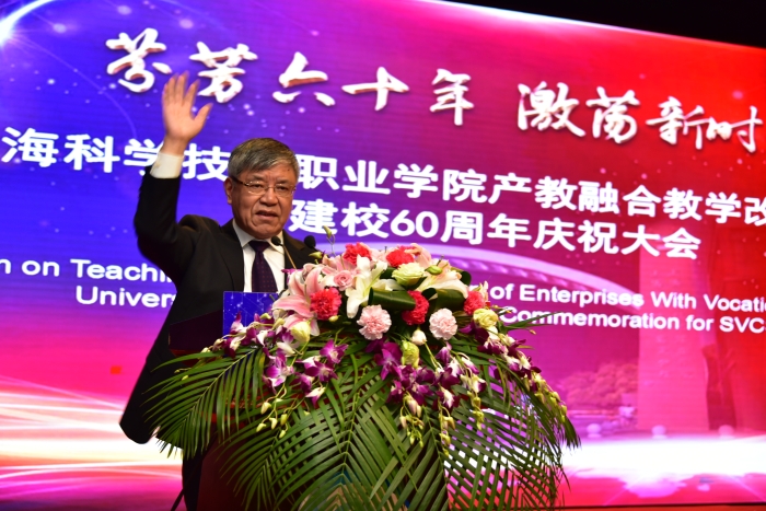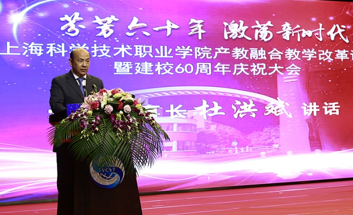 上海科学技术职业学院董事长杜洪斌代表学院举办者致达集团致辞。他说,经过六十年,在全院师生心怀梦想、情系教育,上下一心、团结奋进,不断改革创新,克服困难,砥砺前行的努力奋斗下,使学院始终充满了朝气,焕发着青春活力!尤其是03年以来,学院“敢为人先,探索高职院校公办民营新机制”,在市教委、嘉定区政府的正确领导下,在董事会科学决策下,在全体教职员工共同努力下,学院办学质量有了显著的提高,校园面貌发生了巨大的变化。