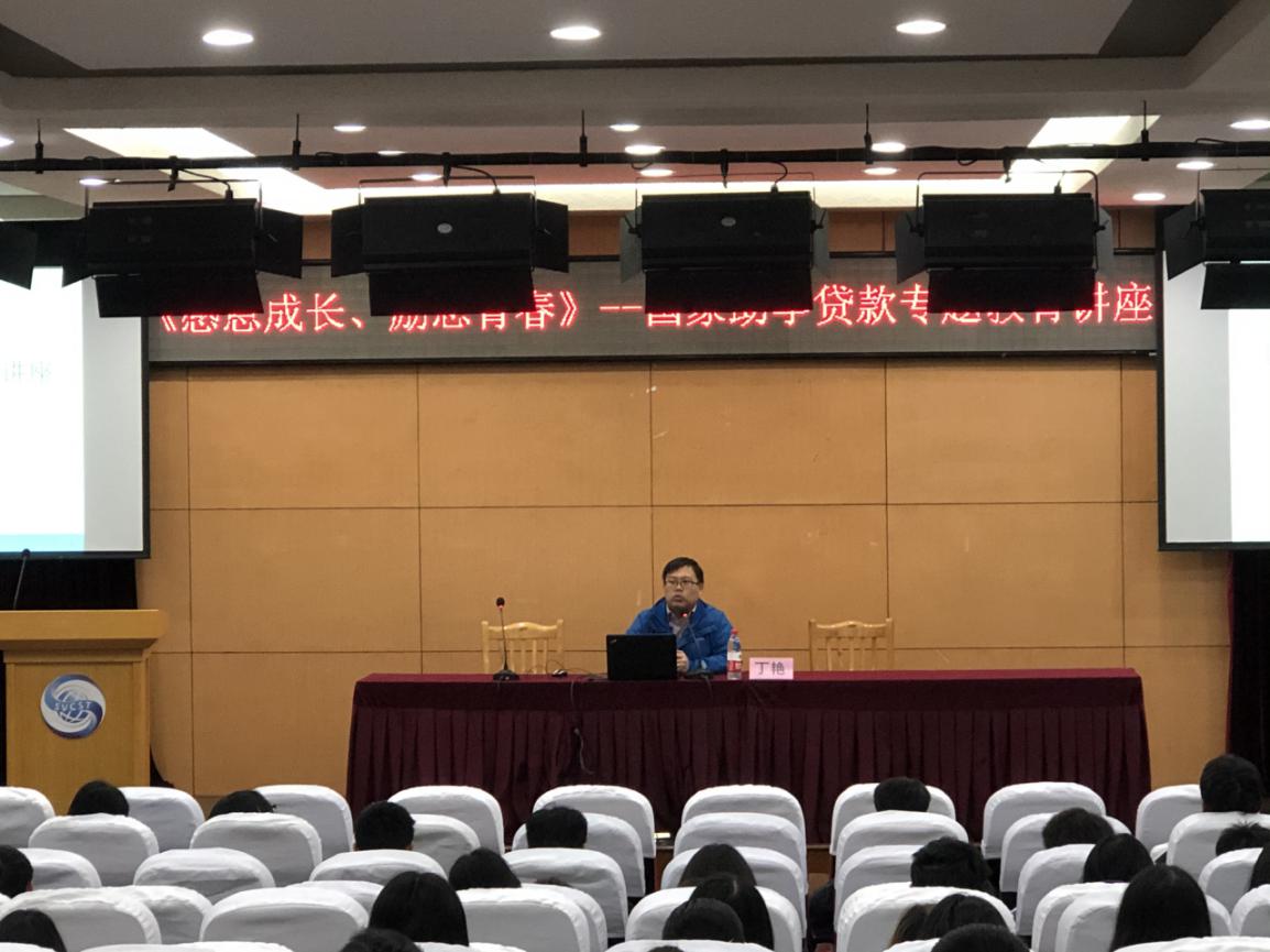 2019年11月26日中午,我院学生资助管理中心、学生工作处于新教五楼报告厅组织开展“感恩成长,励志青春”——国家助学贷款专题教育活动。此次活动邀请中国农业银行嘉定支行信贷部丁艳主讲,我院学生工作处处长沈斌、200余名国家助学贷款学生聆听讲座,学生资助管理中心许云峰主持。