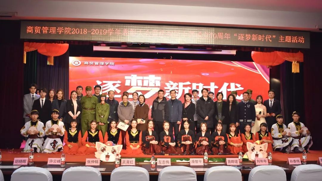 庆祝新中国成立70周年“逐梦新时代”主题晚会精彩纷呈,主题突出。学生们表演了舞蹈《左手指月》,情景剧《钥匙》、《战火奇缘》,手语《不忘初心》,乐器合奏《中国风》共同展示了新时代青年的爱国情怀。相声《幸福源于生活》,共建单位阿姨们带来的《旗袍秀》共同演绎新中国成立70年来的美好生活。今年商贸学院迎来了第一批新疆学子,他们为晚会带来了异域风情的舞蹈《我们新疆好地方》,呈现出不一样的民族风。年轻的辅导员们通过情景剧《我们都是辅导员》表达了立足岗位无私奉献的真情。最后,整场晚会在合唱《家国心·家国梦》的绵绵歌声中落下帷幕。
