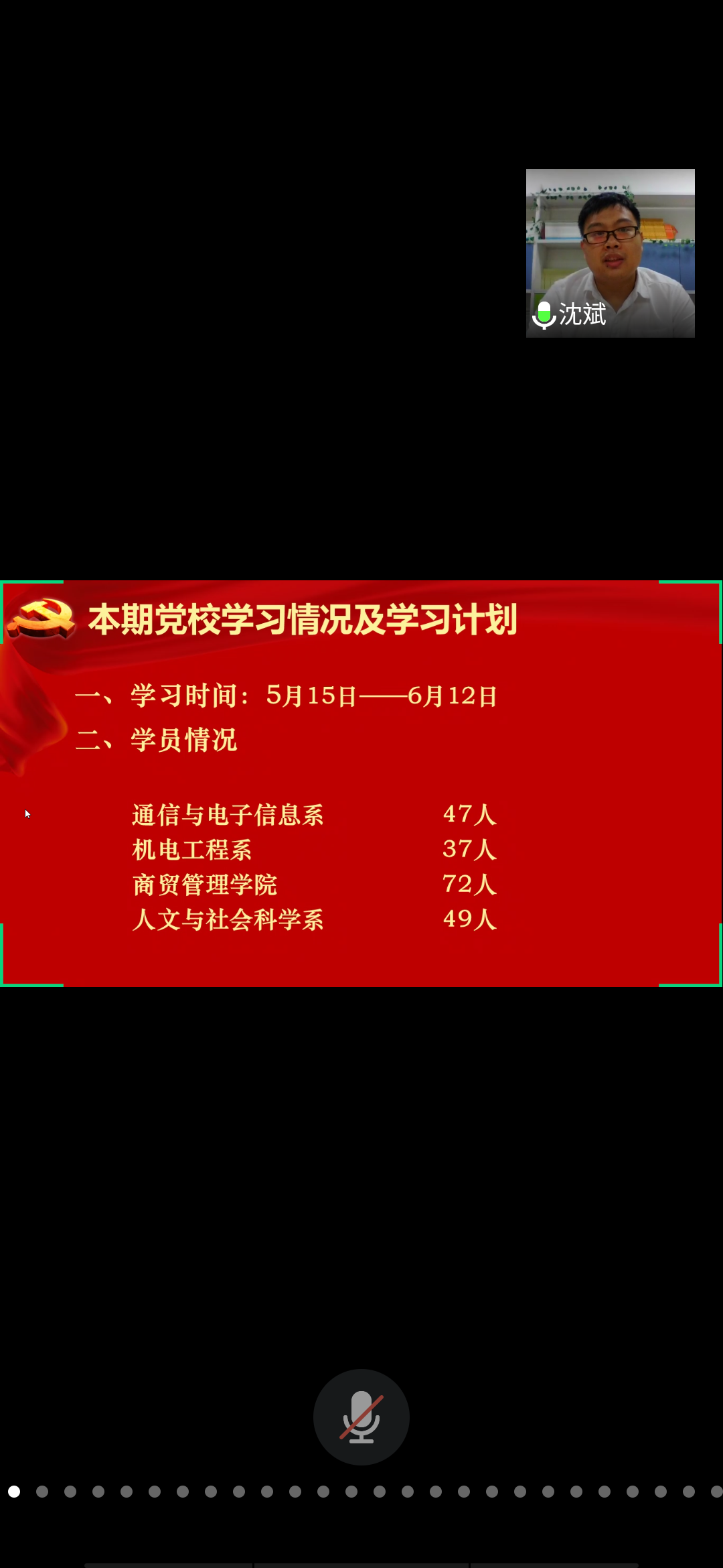 2020年5月15日下午,我院第35期党校入党积极分子培训班开班仪式通过“云连线”的方式在腾讯会议APP上顺利举行。此次开班仪式由我院学生处处长沈斌主持,学院党委书记王云飞及各院系党支部书记出席本次开班仪式。