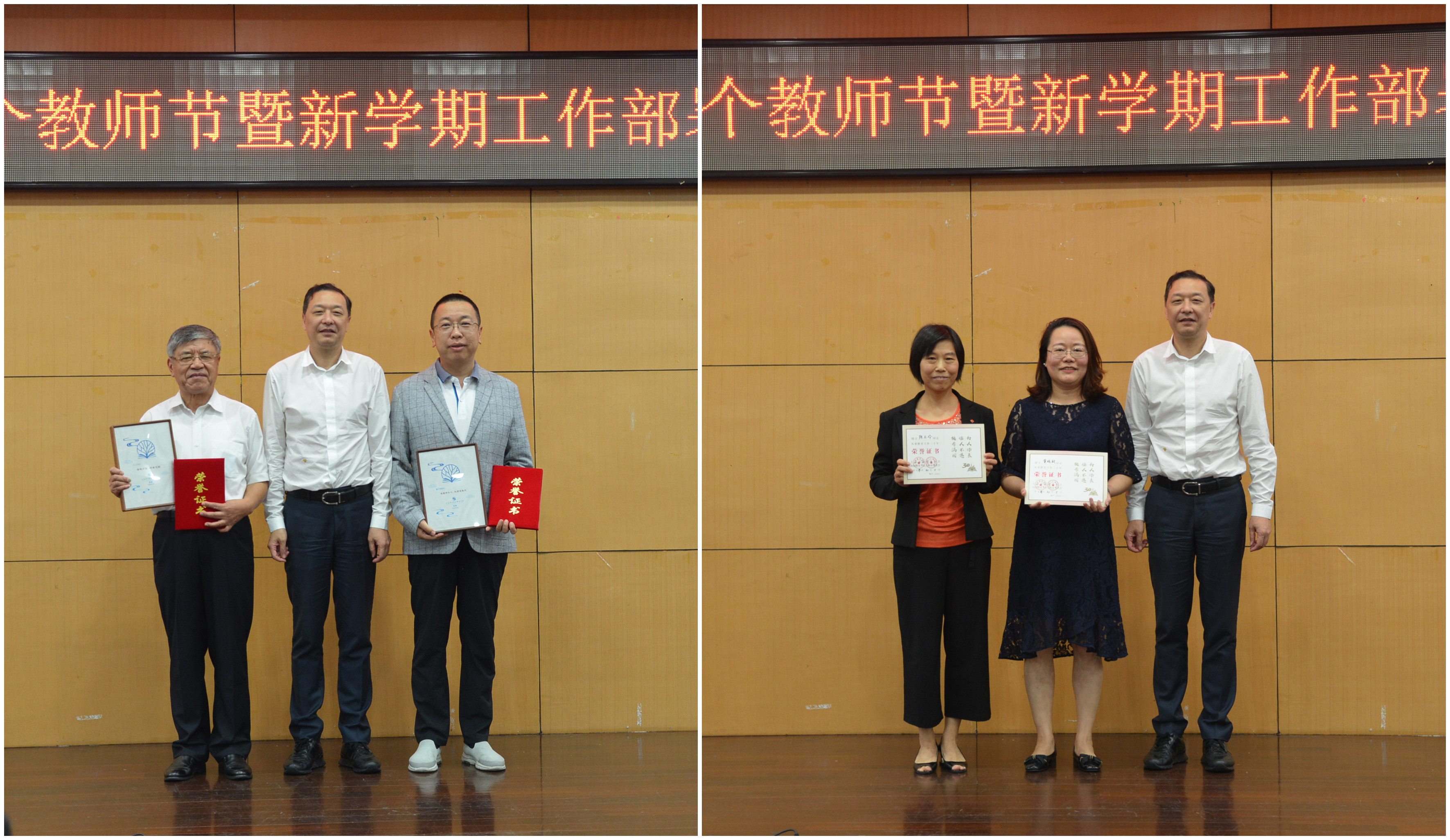 程军副院长宣读了学院2019-2020学年度集体荣誉奖项。个人颁奖环节,首先对唐晓燕、赵建农、沈斌、朱俭、张文喜、郁玉红六位获得第八届“申嘉奖教金”的教师进行了表彰。此次申嘉奖教金特设“特别贡献奖”,以表彰在任期间对学院建设和发展做出重要贡献的董大奎院长和王云飞书记。随后进行的是2019—2020学年其他各类表彰奖励仪式,副董事长杜洪斌,常务副院长韩芳,副院长高康、胡晓晖分别为获奖代表张进、刘克敏等26位教师颁奖,董事长严健军为陈玉玲、黄晓敏两位从教三十年的教师颁发荣誉证书。