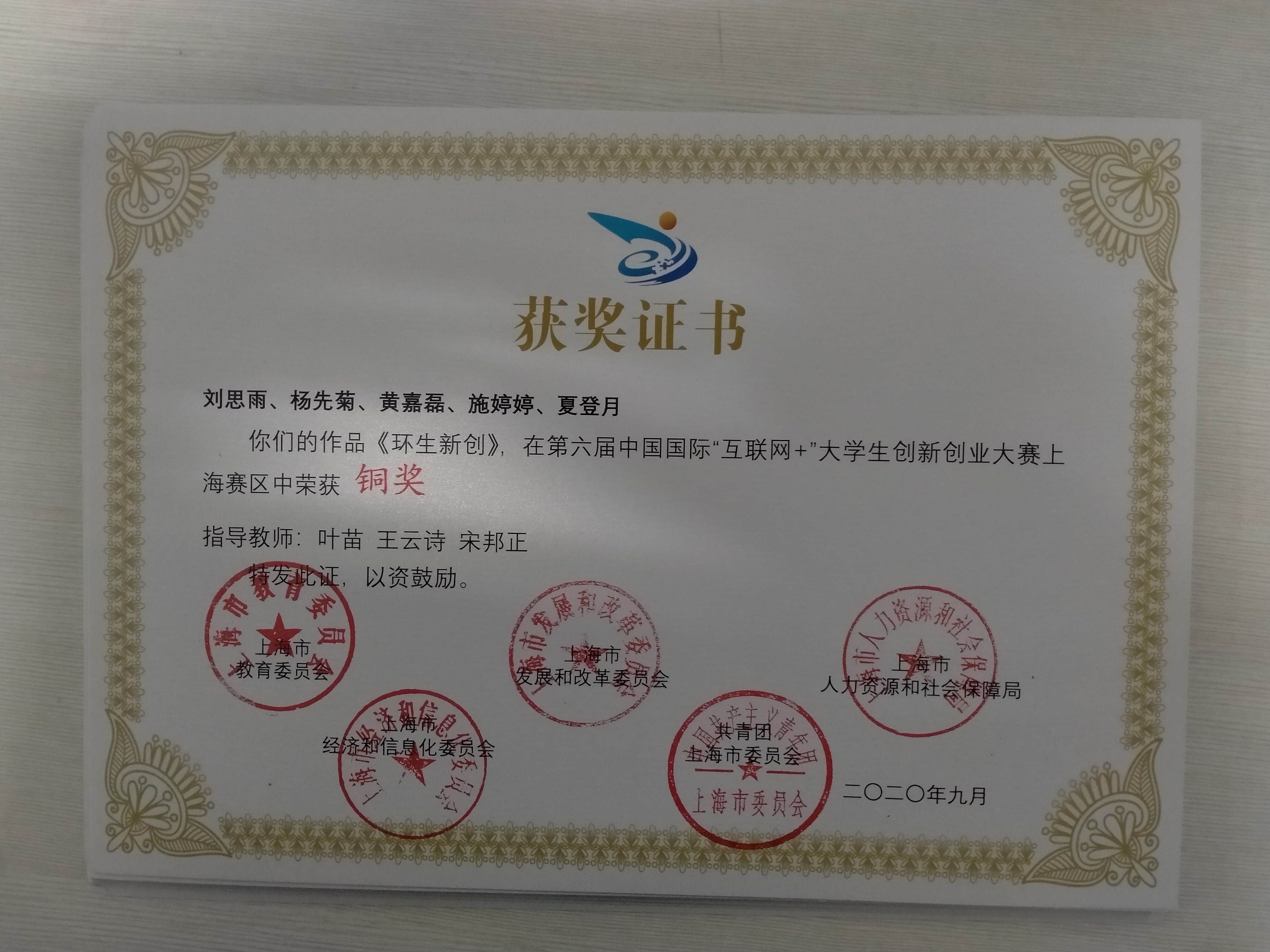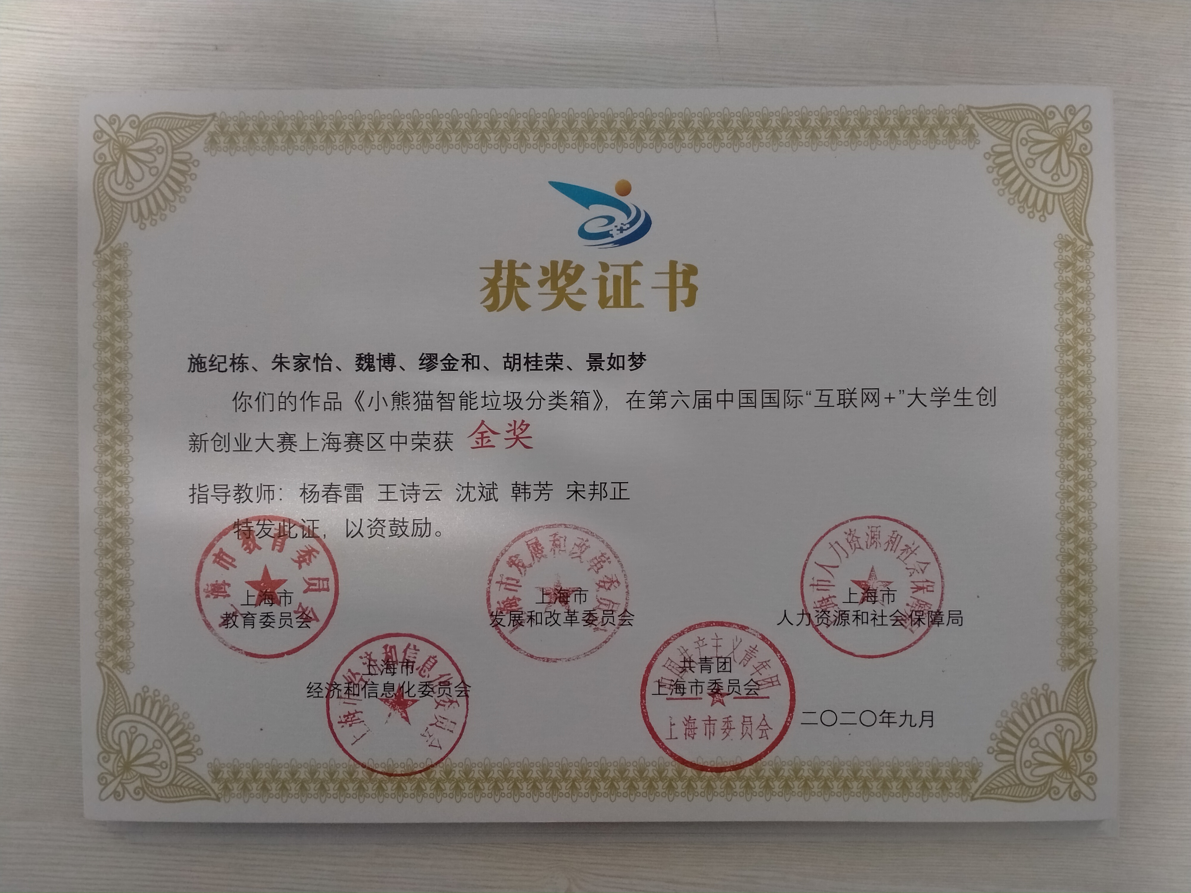 据悉,杨春雷、王云诗、沈斌、韩芳、宋邦正五位老师指导,施纪栋、朱家怡、魏博、缪金和、胡桂荣、景如梦六位同学为团队成员的“小熊猫智能垃圾分类箱”项目获上海赛区金奖。冷宇、宋邦正、刘克敏、张东四位老师指导的,张辰皓、范铭杰、应籽妍、雒籽钰、张鑫浩五位同学为团队成员的“Ai.LIFEBOX 智能生态宠物箱”项目获上海赛区铜奖;叶苗、王云诗、宋邦正三位老师指导的,刘思雨、杨先菊、黄嘉磊、施婷婷、夏登月五位同学为团队成员的“环生新创”项目获上海赛区铜奖。杨春雷、王云诗、沈斌、韩芳、宋邦正五位老师荣获第六届中国国际“互联网+”大学生创新创业大赛上海赛区优秀指导教师称号。