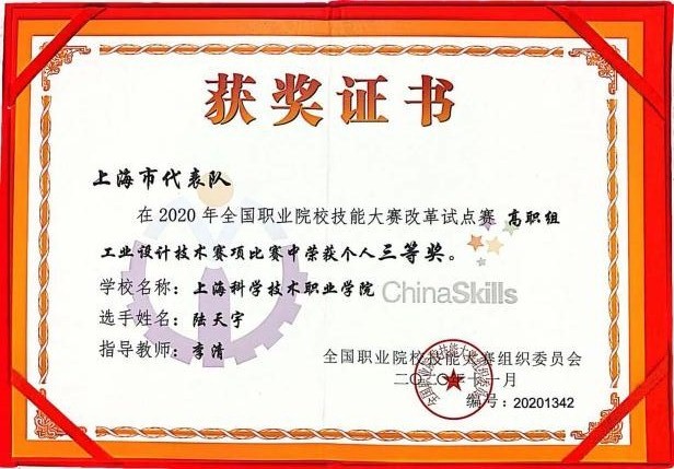 “人人出彩,技能强国”2020年全国职业院校技能大赛改革试点赛——工业设计技术赛项在山东潍坊职业学院完美落幕。本届大赛由教育部、国家发展和改革委员会、科学技术部、人力资源和社会保障部、民政部、财政部、中华全国总工会、中国机械工业联合会联合主办,山东潍坊职业学院承办。比赛汇聚了全国28个省市选拔赛中优秀的选手,经过激烈的角逐,由我校机电工程系李清老师指导的学生陆天宇,代表上海队在众多优秀的选手中脱颖而出,荣获个人三等奖。