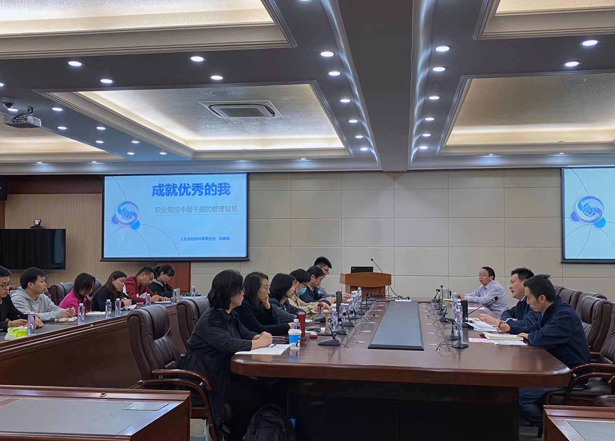 接着由人文与社会科学系主任彭典贵作了《成就优秀的我》的讲座。讲座对职业院校中层干部的自我认知、职责、五大素质和六大能力四个方面进行了梳理和解读。彭主任强调中层管理人员不同于一般员工,在职业院校起着中流砥柱的作用,因此对中层管理者的岗位职责、综合素质和工作能力,要有更高层次的要求。