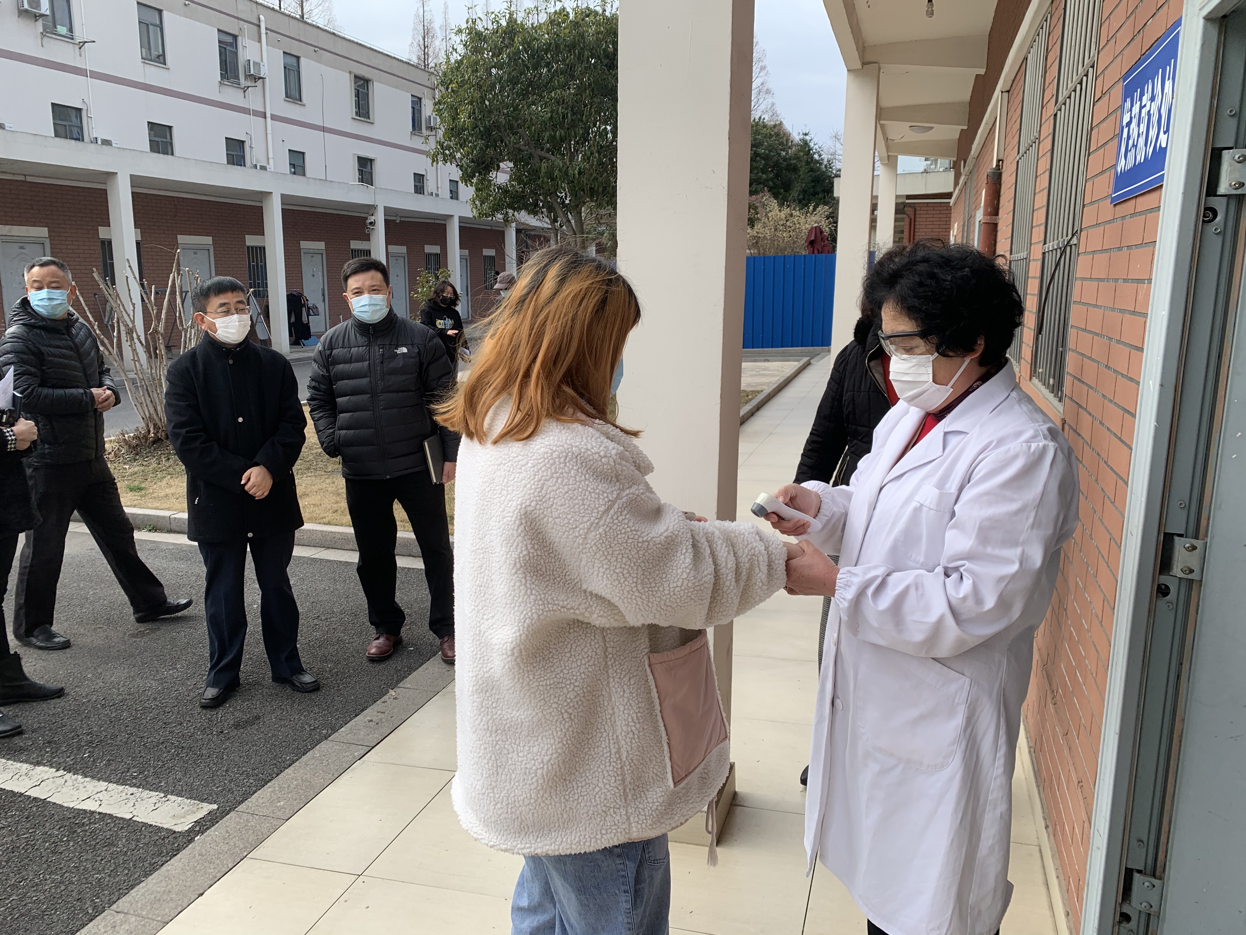 朱建新总裁一行首先参加了学校2021年寒假期间疫情防控应急演练,演练开始后,志愿者们在校门口模拟学生排队开始,戴着口罩,保持一米间距,依次经过测温区、身份查验区、消毒区,排队进入学校。按照演练流程,依次有序的完成了校园出入、食堂就餐、公寓进出、发热处置四个演练科目。
