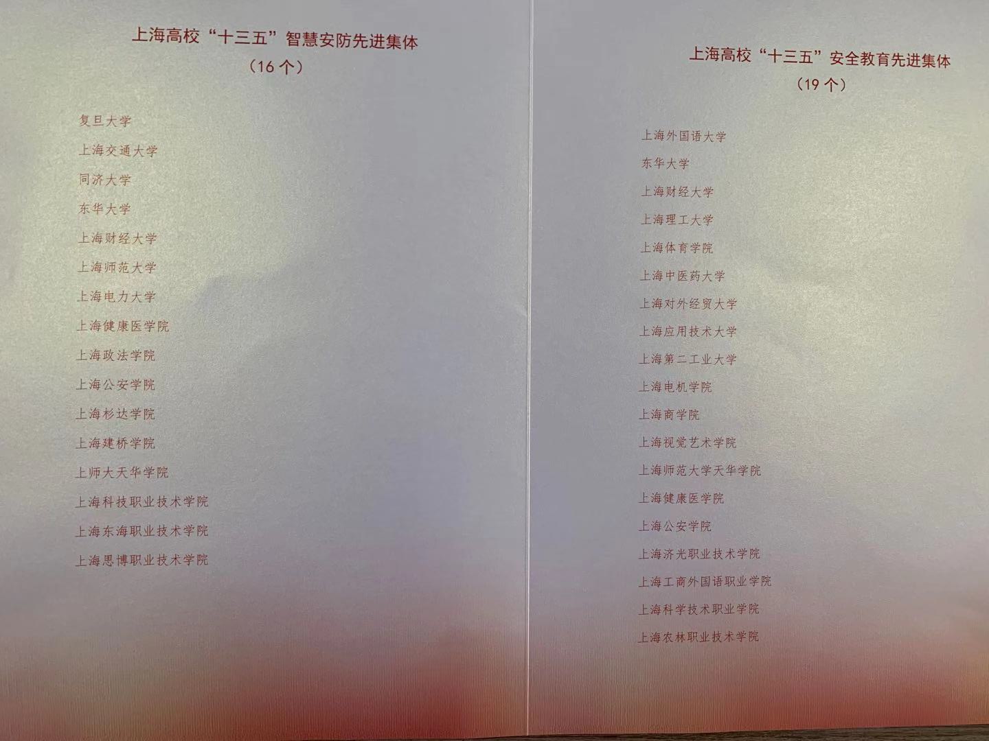在上海62所普通高校中,有16所高校荣获上海高校“十三五”智慧安防先进集体称号,共有19所高校荣获上海高校“十三五”安全教育先进集体称号,其中仅有我校与上海财经大学、上海健康医学院三所高校同时摘得两项荣誉,充分表明了市教委对我校安全工作的全面肯定。