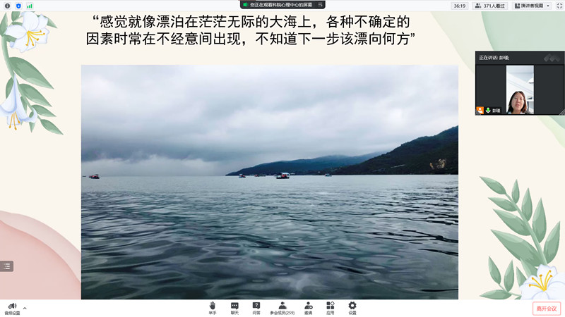 接着彭老师进行现场调研,各个年级的同学们在聊天栏里诉说自己的状况和情绪感受,反馈更多的是想恢复往日的学习和生活节奏,同学们表达了焦虑、伤感、无力和愤怒等情绪。彭老师根据同学们的真实感受讲述人类天生害怕不确定性,面对这些状况时会产生担心或焦虑的情绪,当多次出现时就容易产生自我质疑和自我否定,形成消极无助感。时间持续久就有可能发展成心理障碍,并伴随一些躯体症状。彭老师给同学们出示了抑郁快速筛查量表和焦虑快速筛查量表,现场有同学参测后写出自己的得分,彭老师提醒同学们平时要多关注自身状况,发现问题及时寻求帮助。面对当前不确定性背景,呼吁同学们要做到以下几点个人心理建设:了解自我、坦然面对,将更多的未知转为已知,增强确定感;要以积极的态度来拥抱变化,不确定性可以让我们对未来保持好奇心,充满期望地等待;去行动,去面对和经历,在实践中摸索经验;把不可控看做常态,以自己内在稳定的状态来对待外界的变化。从自己可以掌控的事情开始,做到顺境不骄纵,逆境不退缩,执著无畏;要利用朋辈资源,获取支持,必要的时候要求助专业人士。