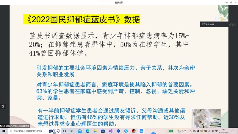 讲座由校专职心理咨询师彭瑾主持召开,彭老师首先以中科院院士、精神病学与临床心理学家陆林的一段视频作为开场。视频介绍了疫情对大众精神健康的影响,抑郁症和焦虑症患者数量急剧上升,并伴随突出的失眠障碍问题。而青少年的心理健康问题尤为突出,社交疏离、学习和生活的界限模糊以及面对未来的很多不确定性,青少年更容易沉迷游戏,生物节律颠倒,情绪低落,甚至不愿意出门等。 彭老师引用了国内的一组调查数据,描述当下青少年出现的“四无”现象:学习无动力、对真实世界无兴趣、社交无能力、对生命价值无感受;分析引发青少年抑郁的主要因素,以及目前仍然有近一半的抑郁症学生没有寻求过任何帮助。