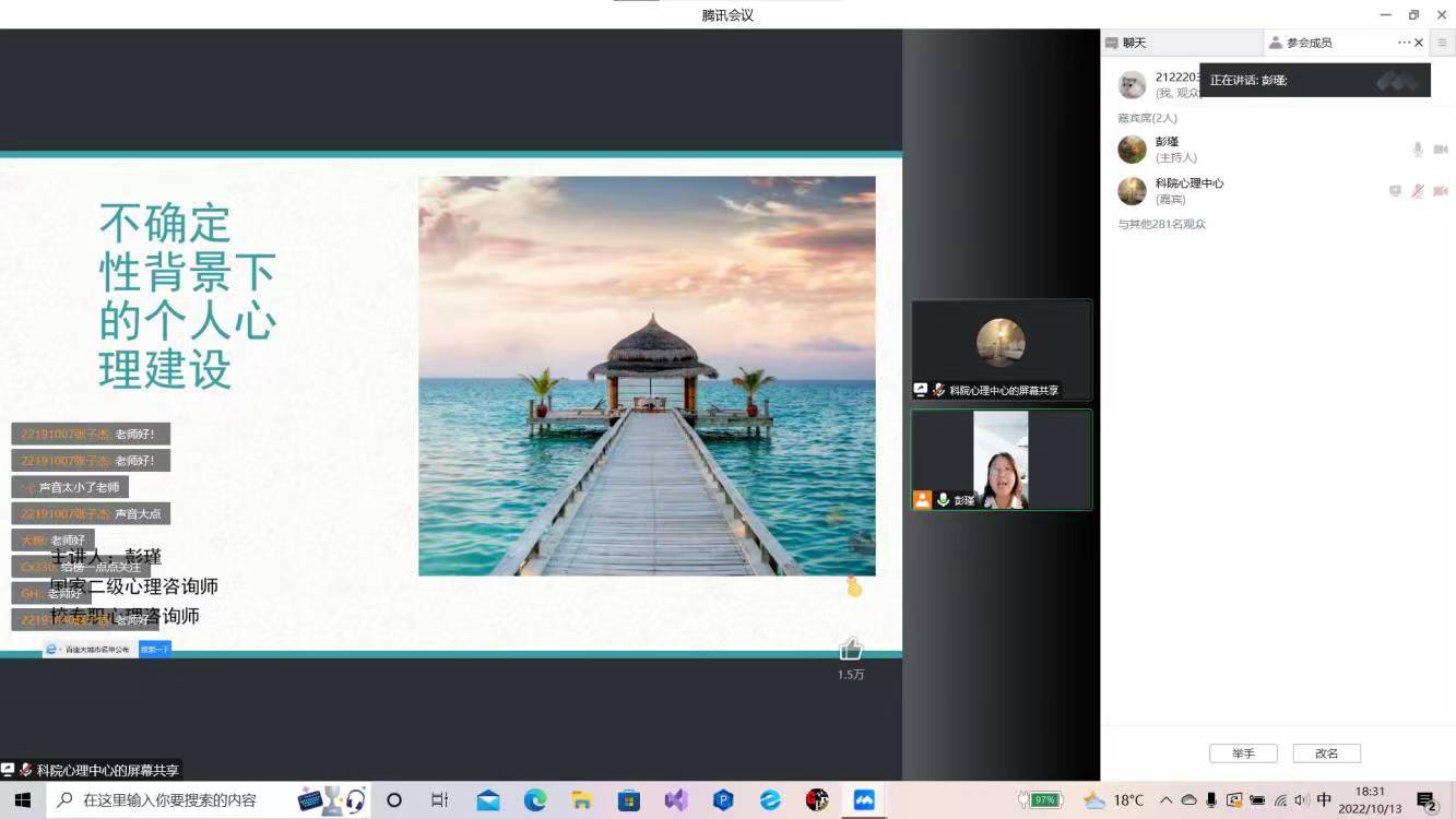 20221010日是第31个世界精神卫生日,主题是“营造良好环境 共助心理健康”。为提高大学生的心理健康意识,校心理健康教育与咨询中心于10131830在腾讯会议面向全体学生开展了专题讲座,总共有300名学生收看讲座并积极参与互动。
