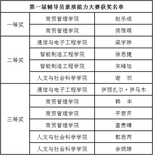 校党委副书记、副院长滑智平,学生工作处处长沈斌,校团委书记贾超男,学生工作处副处长陆媛媛,学生工作处沈蕾,心理咨询中心彭瑾等六位老师担任评委,各二级学院书记、副书记及全体辅导员到场观摩。比赛共决出一等奖2人,二等奖4人,三等奖6人。