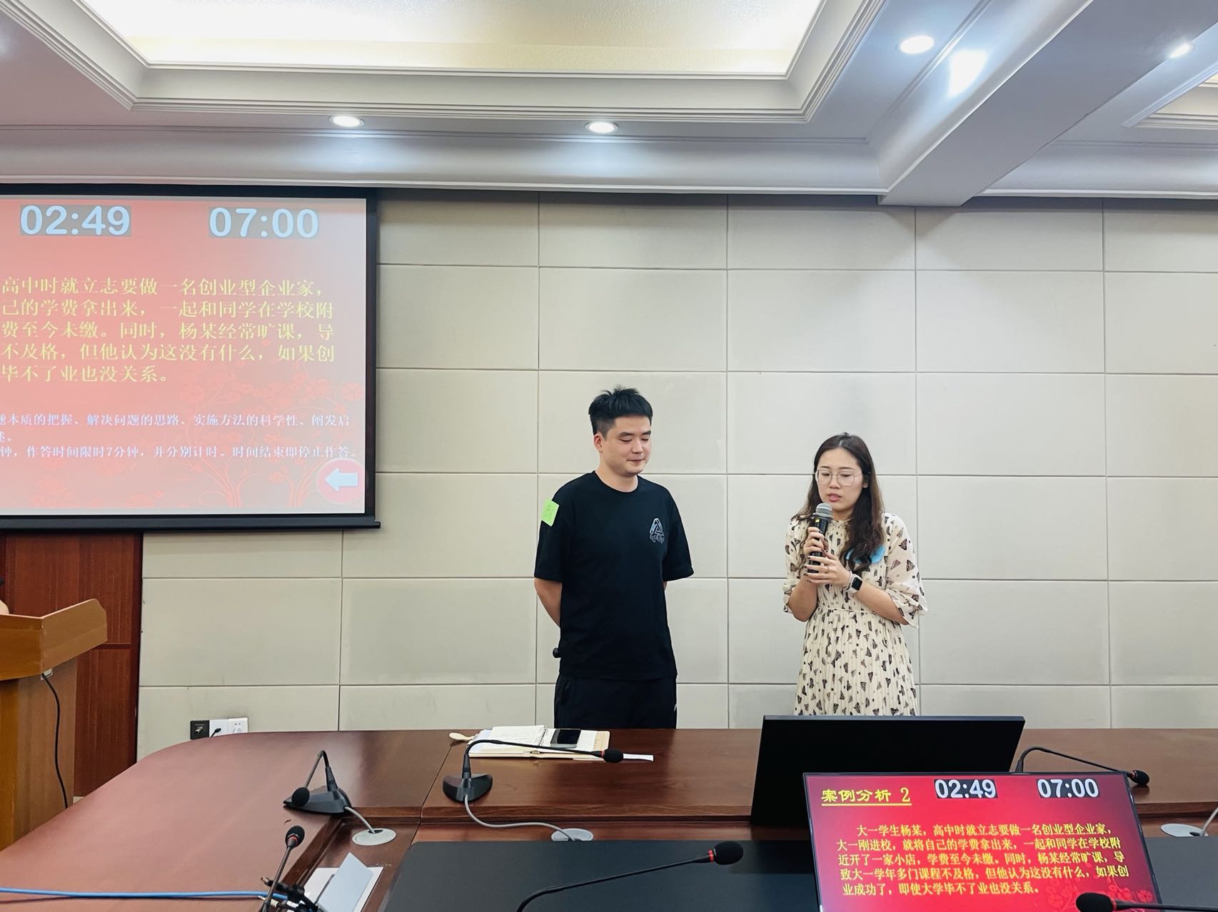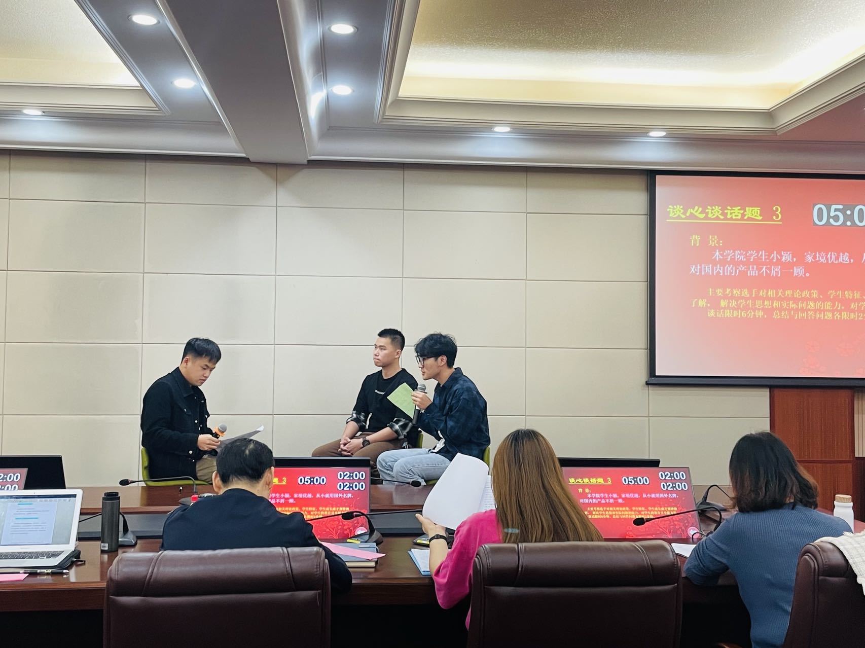 案例分析环节参赛选手两人一组“你问我答”,围绕案例共同辨析原因、研讨对策、总结规律,科学施策;谈心谈话环节,围绕专业学习、宿舍矛盾调解、职业生涯规划、校园贷等主题出现的“问题学生”,参赛选手们与之“斗智斗勇”,动之以情,晓之以理,短短几分钟内体现了较强的解决实际问题的能力。
