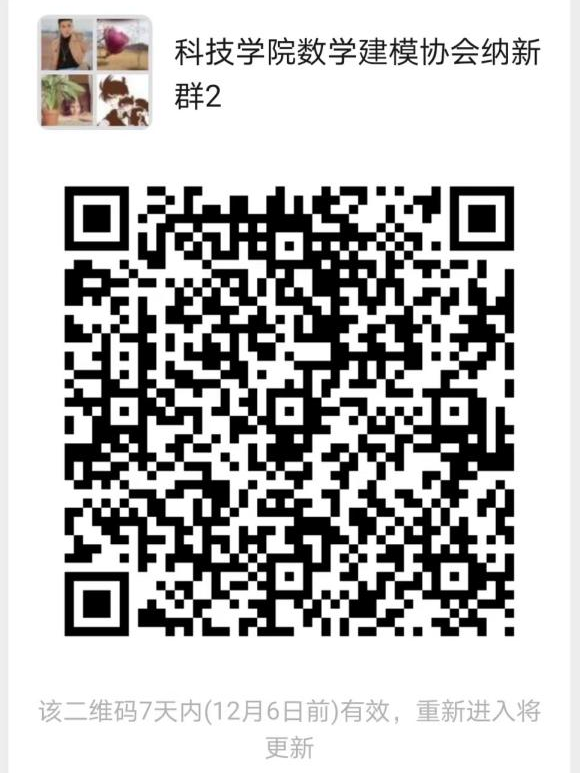 在此面向全校所有年级、所有专业,招纳有志之士的加入,欢迎大家扫描下方二维码加入数学建模协会纳新群哦--