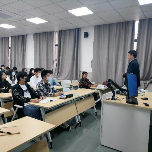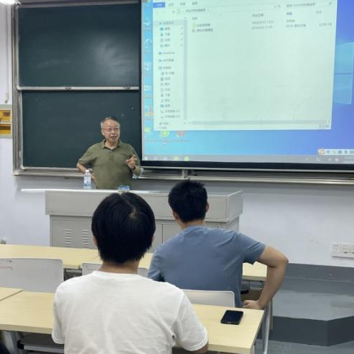 图1-2 我校基础课教学部主任邵汝军教授、特聘教授邬冬华教授在为数学建模协会学生做辅导报告