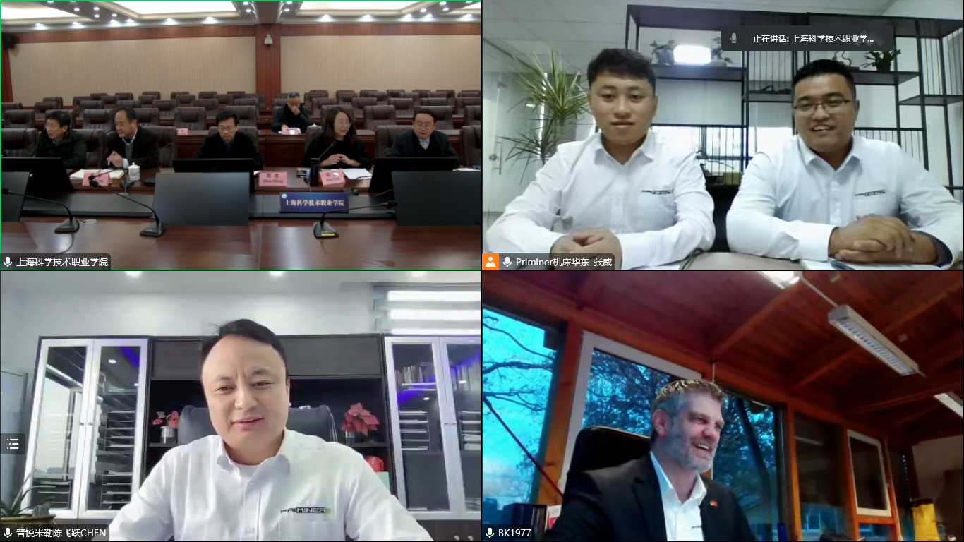 12月2日下午,我校与欧洲知名数控机床生产制造商德国PRIMINER(普锐米勒机床)有限公司举行了线上签约仪式,双方合作成立国内首家Priminer(上海)技术中心。学校党委书记、院长周胜、常务副院长韩芳、副院长高康、德国PRIMINER(普锐米勒机床)有限公司Herrn Benjamin总裁、普锐米勒机床(东莞)有限公司总经理陈飞跃、威跃精密机械(上海)有限公司张威、马文睿,以及我校智能制造工程学院、校企合作办、科技处等相关负责人出席了签约仪式。