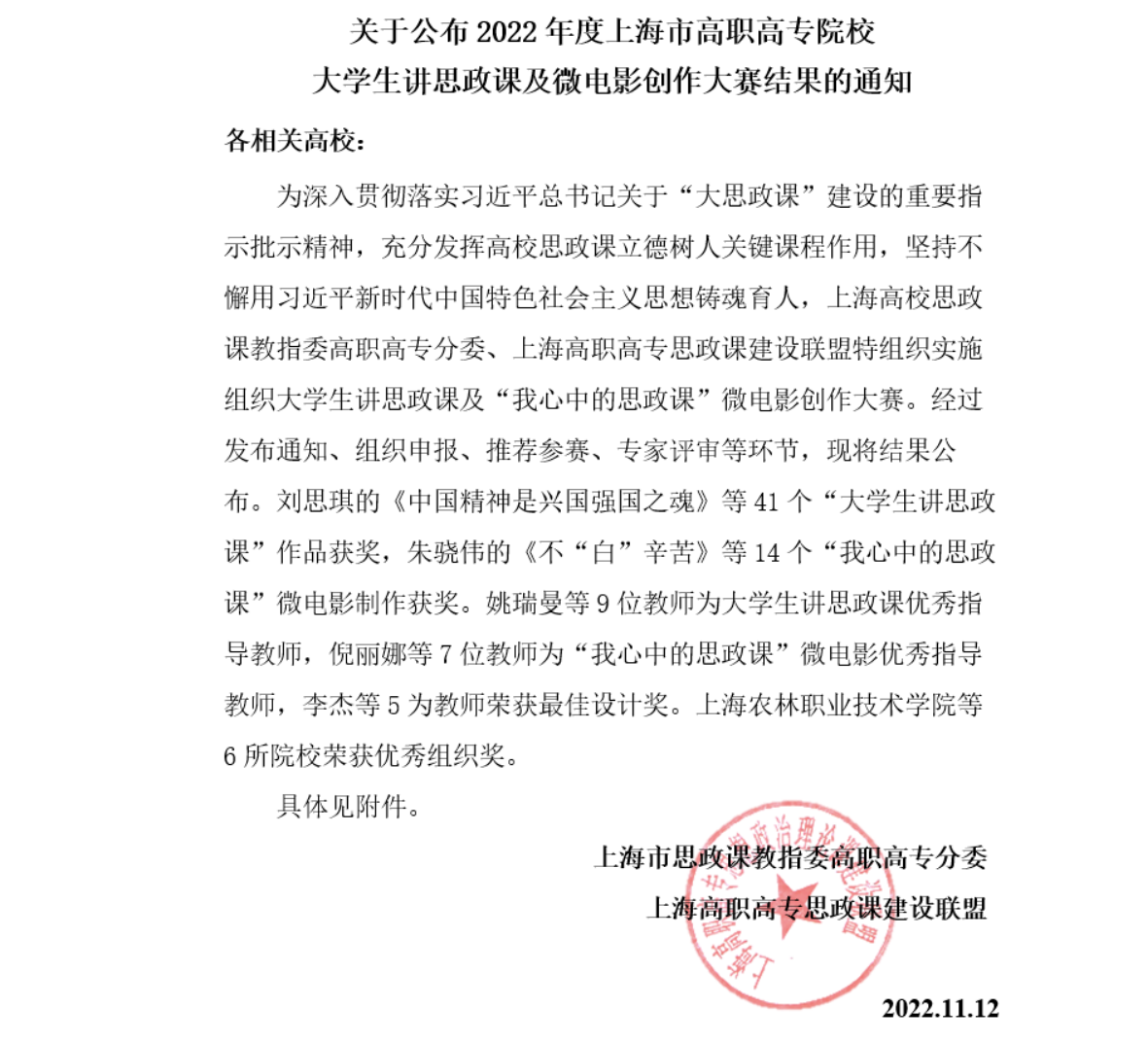 近日,2022年度上海市高职高专院校大学生讲思政课及微电影创作大赛结果公布,我校选送作品《伟大精神铸就伟大时代——中国共产党伟大建党精神》《实现共同富裕是中国特色社会主义的应有之义》获得优秀奖,马院王依娜老师获“优秀指导教师”,刘金静老师获“最佳设计奖”,马克思主义学院获“优秀组织奖”。