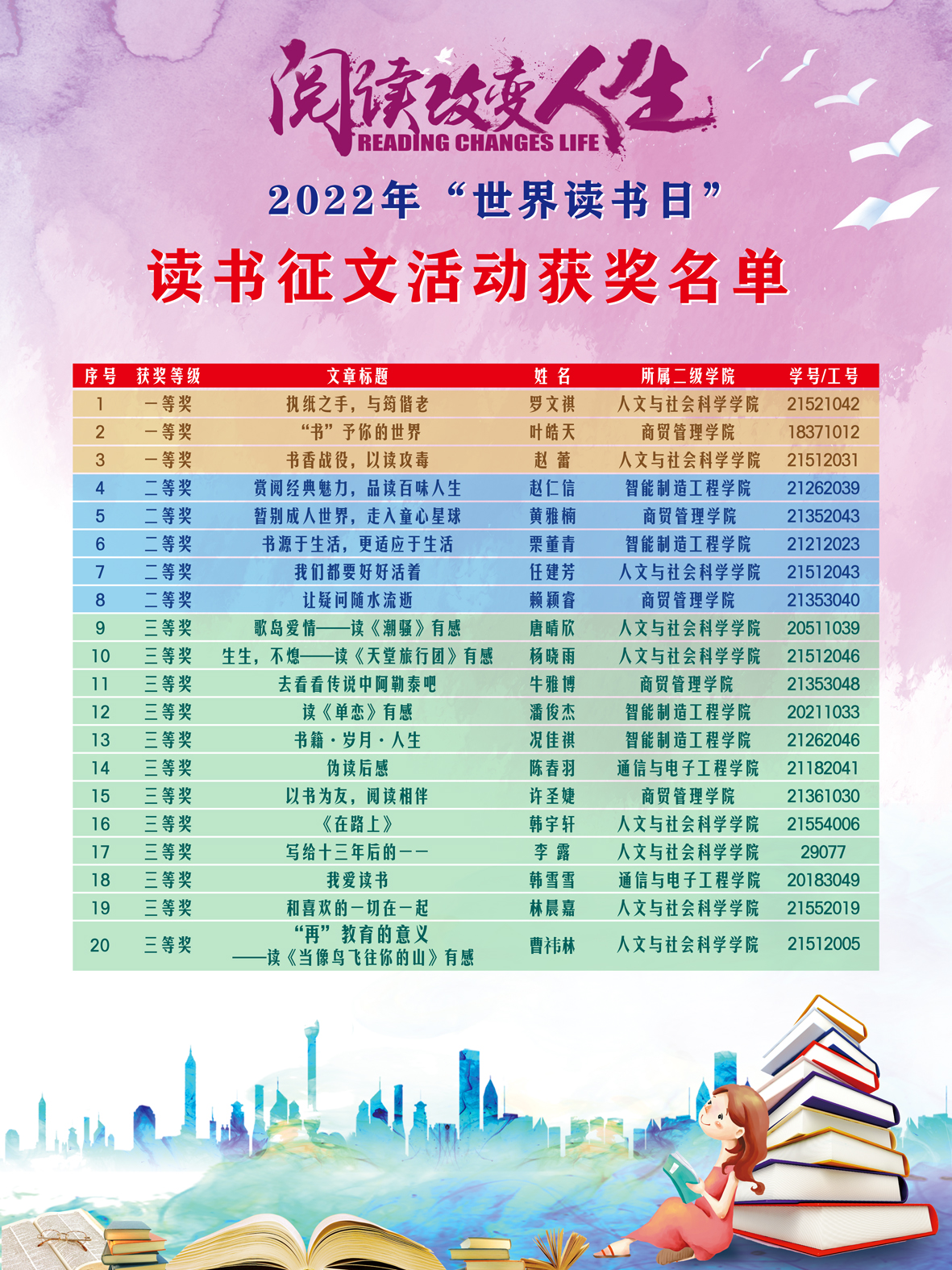 “世界读书日”征文活动由图书馆、语言文字办公室共同举办,语言文字办公室陈小红老师结合近日颁布的《教育部、国家语委关于加强高等学校服务国家通用语言文字高质量推广普及的若干意见》,畅谈进一步提高大学生语言文字应用能力,在全民阅读渐成社会时尚的当下,唯有崇尚读书、尊重知识才能给人类带来真正的进步。