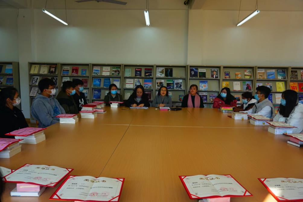 为努力营造“书香致远”的校园文化氛围,激发师生的读书热情,引导读者养成良好的阅读习惯,扎实推进“全民阅读”工作,12月6日中午,我校优秀读者、优秀志愿者、读书征文颁奖活动在校图书馆举办,副院长胡晓晖,图书馆、语言文字办公室老师和相关获奖学生参加了活动,活动由图书馆馆长黄晓敏主持。