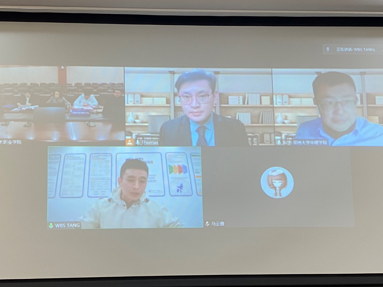 2022年12月6日下午,中德职业教育国际合作协商会暨3+0项目申报交流会在我校召开。学校副院长胡晓晖,国际合作交流处、教务处、招就处、财务处、智能制造工程学院、人文与社会科学学院等二级单位负责人,德国WBS职业教育集团顾问中心国际合作(中国)代表处主任唐斌、郑州大学中德学院副院长纵宇以及河南大学国际教育学院中德项目办公室联络员杨昊等人出席会议。会议由德国WBS职业教育集团顾问朱玥龙主持。