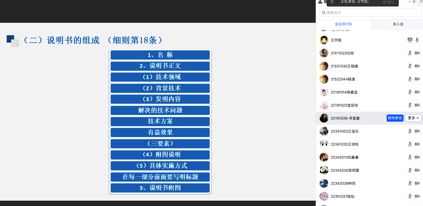 随后,王宇航重点讲解了申请专利所需要的条件和准备工作,针对知识产权管理办法、专利交底书撰写、专利申请、说明书的整体撰写要求及等各个方面作了深入浅出地讲解。