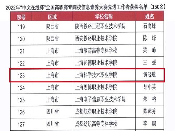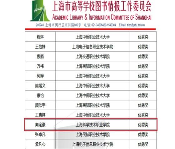 最终,我校智能制造工程学院向定豪同学获“智信杯”上海高校信息素养挑战赛优秀奖;黄晓敏老师获第四届全国高职高专院校信息素养大赛“先进工作者”。