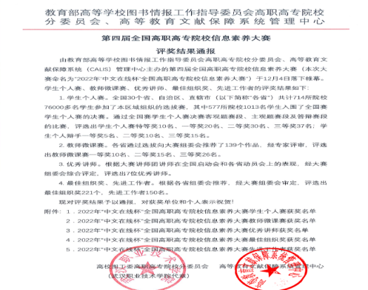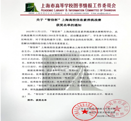 历时3个月的第四届全国高职高专院校信息素养大赛、“智信杯”上海高校信息素养挑战赛近日落下帷幕。“全国高职高专院校信息素养大赛”是由教育部高校图工委高职高专分委员会、高教文献保障系统(CALIS)管理中心共同举办的大型赛事,今年全国714所高职院校参赛,我校第二次参与此赛事;“智信杯”上海高校信息素养挑战赛由上海市高校图工委主办,今年全市35所高校参赛。两个比赛都以线上答题、现场答辩的形式开展,主要考察学生应当具备的信息意识、信息知识与信息技能;运用网络化的手段获取信息的能力,进行信息甄别的能力,以及加工处理信息的能力。
