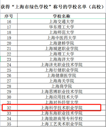 2022年7月,上海市教委、市发展改革委组织启动了第二批“上海市绿色学校”创建工作。经创建发动、学校自评、各区教育局和专家网上评审、市级实地评估等流程,上海科学技术职业学院荣获“上海市绿色学校”称号。